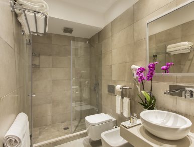 Our classic room "Bacco" offers a cozy and refined atmosphere. You can choose between a double bed or two single beds, ensuring maximum flexibility according to your preferences. The private bathroom is equipped with a spacious shower and stylish furnishings, adding a touch of elegance to your experience.