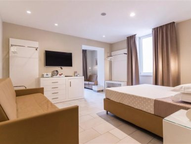 The spacious and elegant bedroom features a king-size double bed or, if needed, two single beds, a comfortable pull-out sofa bed for two people (2 single beds), and a fifth rollaway bed to accommodate an additional guest.