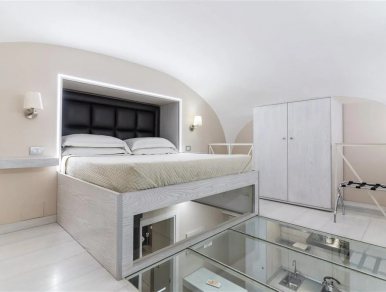 The "sleeping area," accessible by stairs, is located on the second level, featuring a designer double bed and the apartment window with vasistas opening.