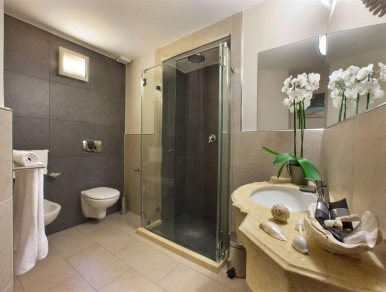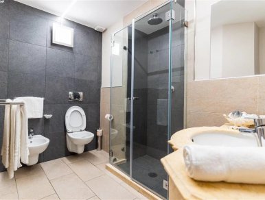 What makes our "Mediterranea" special is the partially glass floor and the division into two levels. The first level features a private bathroom with a spacious waterfall shower, a fully equipped kitchen, and a pull-out sofa bed (two single beds).