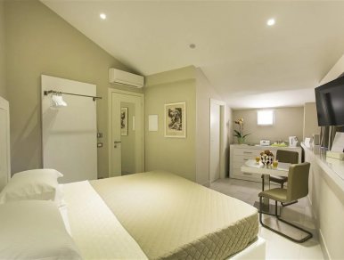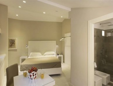 Natural light from outside creates a luminous effect that reflects on the furnishings in light tones, illuminating every corner of the accommodation. Suite "Minerva" is designed to offer a welcoming and sophisticated environment where guests can enjoy a comfortable stay immersed in a modern and elegant design style.