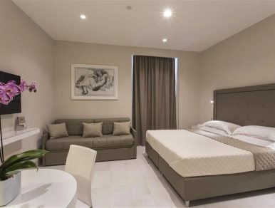 Our charming Suite "Zeus," a magical place for your stay in Sorrento. Thanks to the presence of a king-size double bed or, if needed, two single beds, and a pull-out sofa bed, it can accommodate up to 4 guests.