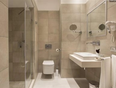 The warm tones are also reflected in the bathroom, equipped with a spacious shower and designer fixtures.