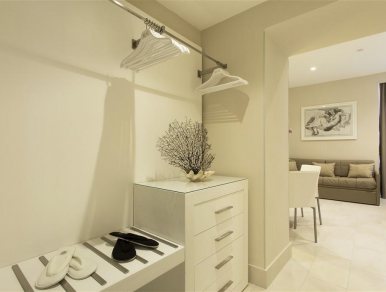 Abundant natural light from outside enhances the furnishings in light colors, creating a bright and relaxing atmosphere throughout the suite.